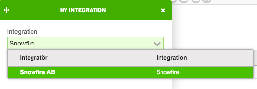 Längre ner på sidan finns knappen Lägg till integration. I rutan som dyker upp, sök fram Snowfire och spara.